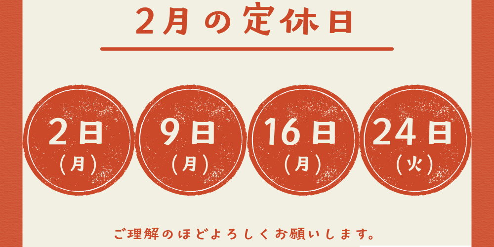 2026年より、定休日が変更になります。 現在:毎週月曜日(祝日の場合は営業) ↓ 2026年より:毎週月曜日 (月曜日が祝日の場合は営業し、翌日の火曜日が定休日) ご迷惑をおかけいたしますが、よろしくお願いいたします。お問合せフォームの不具合について